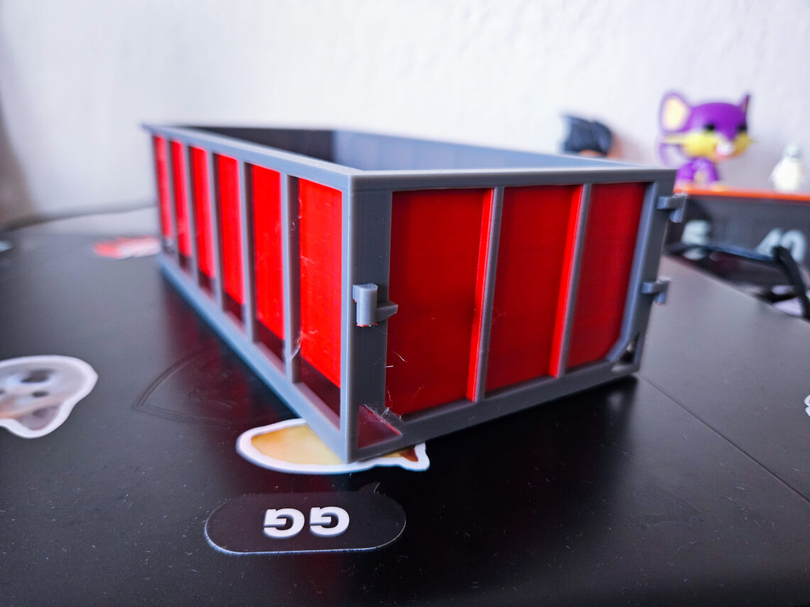 Hasiok, czyli w gwarze śląskiej śmietnik. Ten konkretny został wydrukowany z myślą o zbieraniu “kup” z drukarki 3D. Co to za “kupy”? Zlepki filamentu, które drukarka usuwa po tym, jak zmienia filament na filament innego kolor.